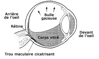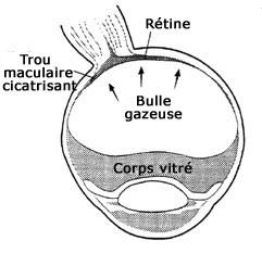 Pour réparer la fente ou le trou maculaire ainsi causé, le chirurgien retire une partie du corps vitré et y place une bulle gazeuse. Le rôle de cette bulle gazeuse est alors de créer sur la paroi maculaire la pression nécessaire à sa cicatrisation.